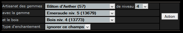 La confection des sceptres et des bâtons demande deux matières premières : un morceau de bois et une émeraude que vous devez renseigner dans le deuxième et troisième sélecteur.